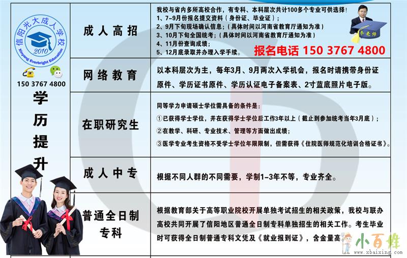 成人高考1.成人教育专业齐全、费用低;2.正规学历,学信网可查;3.考试简单,稳妥毕业;报名咨询方式15037674800微❤同号!信阳光大成人学校函授站,学历提升报名中心,李锐李老师网上报名入口ww...